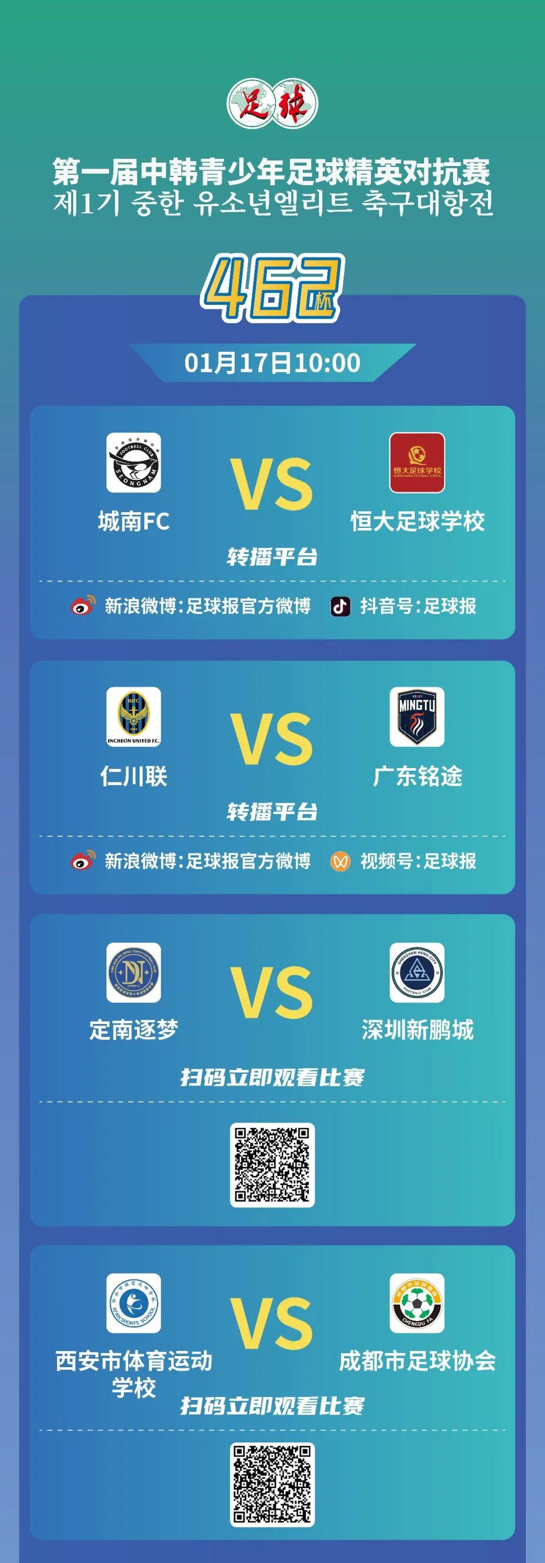 寒冰发自江西定南1月17日,“462杯”第一届中韩青少年足球对抗赛进入第6比赛日,也是第一阶段的收官战。本轮将决定第一阶段各队排名,积分前8名球队进入争冠组,后8名球队进入排位组。已锁定争冠组名额的恒大足校和广东铭途,将分别在第6轮对阵目前排名前两位的城南FC和仁川联。城南FC开赛5轮豪取15分,仁川联仅在面对恒大时被逼入点球大战但仍最终取胜,广东两强能否打破韩国双雄的不败金身成为最大看点。